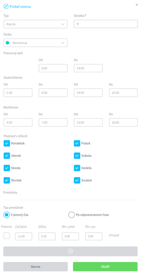 Tu zo zoznamu vyberiete typ zmeny (ranná, poobedná, denná, nočná). Potom vyplníte skratku zmeny, ktorá je povinná a tiež si vyberiete farbu, ktorou bude zmena označená v rozpise zmien alebo v plánovaní (podľa verzie Vášho programu). V ďalšej časti pracovný čas zadáte od kedy a do kedy trvá pracovná zmena, a tiež zvolíte Rozšírenie a Zaokrúhlenie zmeny. Môžete zvoliť, že táto zmena bude platiť iba pre určité dni a ostatné dni budú nastavené podľa inej zmeny. Na konci opäť nastavujete automaticky generované prestávky ako pri pružnej zmene. To znamená, či sa prestávky budú automaticky generovať, a ak áno, tak aj presný čas v každý deň alebo po určitom odpracovanom čase.