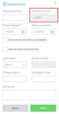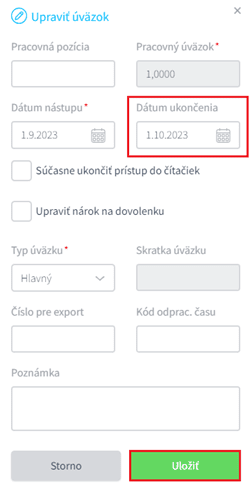 Zmenu musíte urobiť tak, že aktuálny úväzok ukončíte. Zadáte dátum ukončenia k nejakému dátumu a voľbu potvrdíte tlačidlom Uložiť.