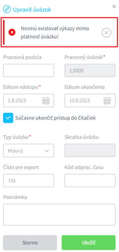 Táto hláška znamená, že v mesačnom výkaze zamestnanca je ešte v nasledujúcich dňoch po dátume, ku ktorému chcete úväzok ukončiť, evidovaná dochádzka. Pokiaľ skutočne chcete úväzok spätne zmeniť, musíte vo výkaze všetky zmeny vymazať a až potom Vám úväzok pôjde ukončiť. Keď vytvoríte nový úväzok, budete musieť do výkazu dochádzku doplniť ručne. Preto je ideálny úväzok meniť vždy až od dátumu v budúcnosti.