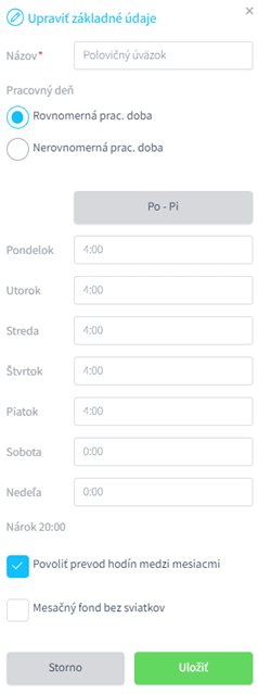 Stačí vytvoriť novú pracovnú skupinu a v časti Upraviť základné údaje vyplníte, že denný fond v tejto pracovnej skupine je 4:00 hod. Potom čo skupinu uložíte, tak do nej môžete všetkých zamestnancov s polovičným úväzkom preradiť. Ich dochádzka sa bude riadiť podľa pravidiel nastavených v tejto novo vytvorenej pracovnej skupine. (Viac v postupe Ako nastaviť pracovnú skupinu).