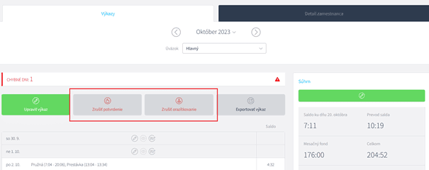 Zobrazí sa detail výkazu kde v hornej časti sa nachádza tlačidlo Zrušiť potvrdenie a Zrušiť opečiatkovanie. Ako náhle tieto voľby potvrdíte, zmeny sa už znova začnú počítať.