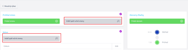 Dostanete sa do detailu dňa a v Prehľade zmien uvidíte možnosť Vrátiť späť ručné zmeny. Pokiaľ bolo zasiahnuté aj do výpočtu v Súhrne, tak aj tu sa zobrazí možnosť Vrátiť späť ručné zmeny. Záznam do prehľadu zmien je nadriadený záznamu z čítačky. Ak máte dáta z čítačky a z nich sa počíta zmena a tento výpočet zmeny zmažete, ide o ručný zásah a ten má prednosť. Po vrátení by sa mala zmena korektne načítať podľa Záznamu z čítačky.