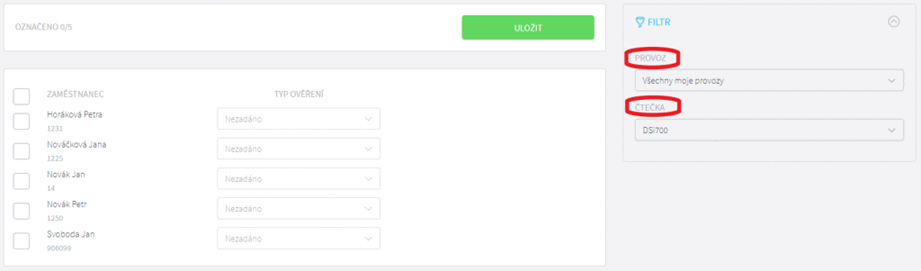 Vo filtri na pravej strane zvoľte buď konkrétnu prevádzku alebo všetky prevádzky a zobrazí sa zoznam zamestnancov podľa zvoleného výberu. Ďalej vo filtri zvoľte v zozname čítačiek konkrétnu čítačku do ktorej chcete zamestnanca autorizovať.