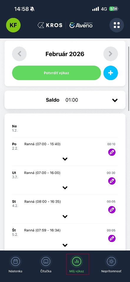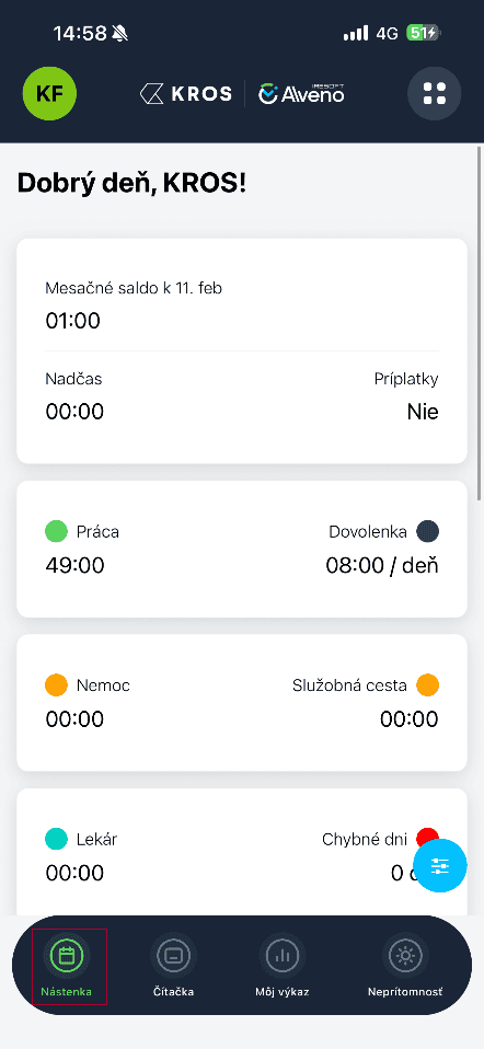 V aplikácii máte možnosť využívať tlačidlá Nástenka, Čítačka, Môj výkaz a Neprítomnosť.