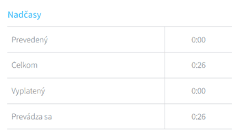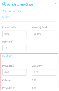 Na konci mesiaca môžete súhrn výkazu upraviť (v pravej časti mesačného výkazu) a do riadku Vyplatený zadáte, koľko hodín chcete zamestnancovi preplatiť ako nadčas. Pokiaľ mu nepreplatíte všetky hodiny, tak zostatok nadčasov sa zamestnanci prevedie do ďalšieho mesiaca. Túto hodnotu uvidíte v riadku Prevádza sa. Pokiaľ už niektoré nadčasy boli prevedené z predchádzajúceho mesiaca, tak túto hodnotu nájdete v riadku Prevedený.