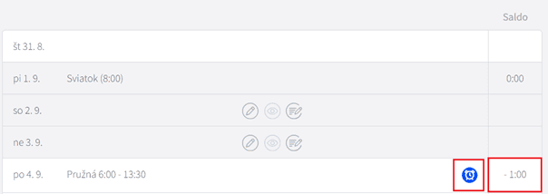 Pokiaľ zamestnanec má denne odpracovať 8 hodín a ide domov o hodinu skôr, tak do salda ide hodnota -1:00 a na výkaze súčasne s touto hodnotou vidíte príznak upozorňujúci na záporné saldo v danom dni.