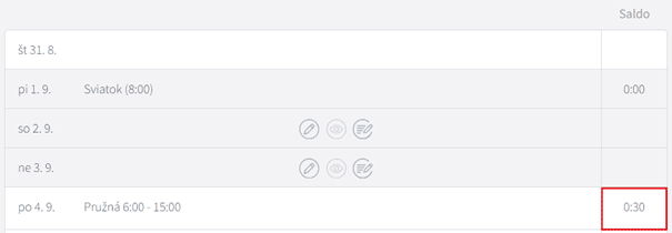 V tomto prípade, pôjde do salda hodnota +30 minút. Túto hodnotu uvidíte na výkaze pri danom dni.