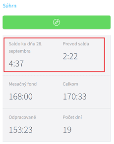 Celkovú hodnotu salda v danom mesiaci vidíte v súhrne výkazu. Pokiaľ si v nastavení pracovnej skupiny označíte voľbu Povoliť prenos hodín medzi mesiacmi, tak sa Vám hodnota salda z konca mesiaca presunie do ďalšieho mesiaca a postupne sa k nemu pripočítava/odpočítava saldo aktuálneho mesiaca. Saldo z predchádzajúceho mesiaca je zobrazené aj zvlášť v časti Prevod salda.