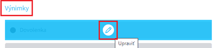Všetky neprítomnosti, ktoré chcete plánovať a schvaľovať, nastavíte na karte Nastavenia. Nájdete tu zoznam výnimiek (Viac v postupe Ako pridám vlastnú výnimku a nastavím ju ako prerušenie na čítačke). Na výnimku, ktorú chcete plánovať, prejdete myšou a zvolíte možnosť Upraviť.