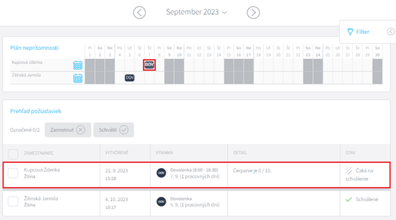 Schvaľovať neprítomnosť je možné dvoma spôsobmi. Jeden variant je kliknúť na symbol oka v zozname požiadaviek. Druhým variantom je kliknúť na požiadavku priamo v kalendári a otvorí sa rovnaké okno pre schválenie požiadavky.