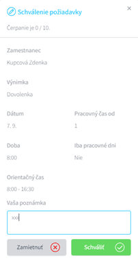 Keď mu príde nová požiadavka, vedúci prevádzky na základe týchto informácií rozhodne, či zamestnancovi neprítomnosť schváli alebo zamietne. Ak sa vedúci rozhodne požiadavku zamietnuť, musí zadať dôvod zamietnutia. Dôvod sa následne zobrazí danému zamestnancovi v detaile požiadavky.