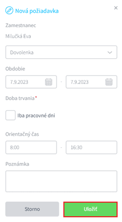 V zozname vyberiete plánovanú neprítomnosť a vyberiete obdobie. Následne požiadavku uložíte cez tlačidlo Uložiť. Vo formulári môžete zadať aj nepovinné údaje Orientačný čas a Poznámka.