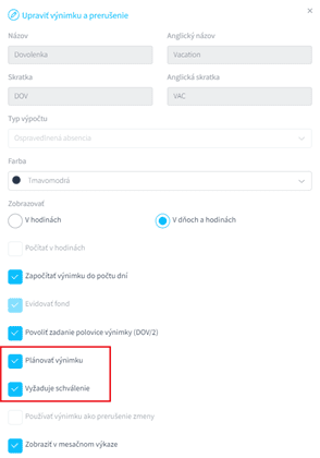 V detaile výnimky zakliknete voľbu Plánovať výnimku. Ak chcete, aby užívateľ, ktorý má právo na schvaľovanie neprítomností v danej prevádzke (viac v postupe Ako pridať zamestnancovi práva na prácu v programe), túto výnimku schvaľoval, zakliknete tiež voľbu Vyžadovať schválenie a nastavenie uložíte.