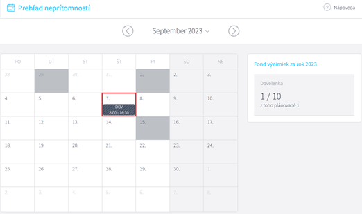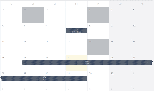 V kalendári potom vidíte neprítomnosť, buď vyplnenú plnou farbou, čo znamená, že Vaša požiadavka bola už schválená vedúcim. Pokiaľ je farba šrafovaná, tak je požiadavka v stave „Čaká na schválenie„.