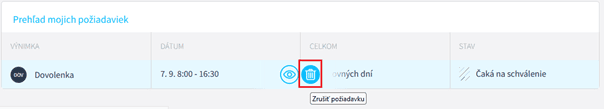 Ak sa pomýlite, tak požiadavku, ktorá ešte nie je schválená Vašim nadriadeným, môžete zrušiť. Stačí sa na požiadavku postaviť myšou a kliknúť na symbol koša. Tým sa požiadavka zruší a vedúci o tom dostane informáciu.