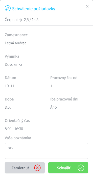 Keď vedúci prevádzky dostane novú požiadavku na neprítomnosť, na základe uvedených informácií sa rozhodne, či ju schváli alebo zamietne. V prípade, že sa vedúci rozhodne požiadavku zamietnuť, musí zadať dôvod zamietnutia – ten sa následne zobrazí zamestnancovi v detaile požiadavky.