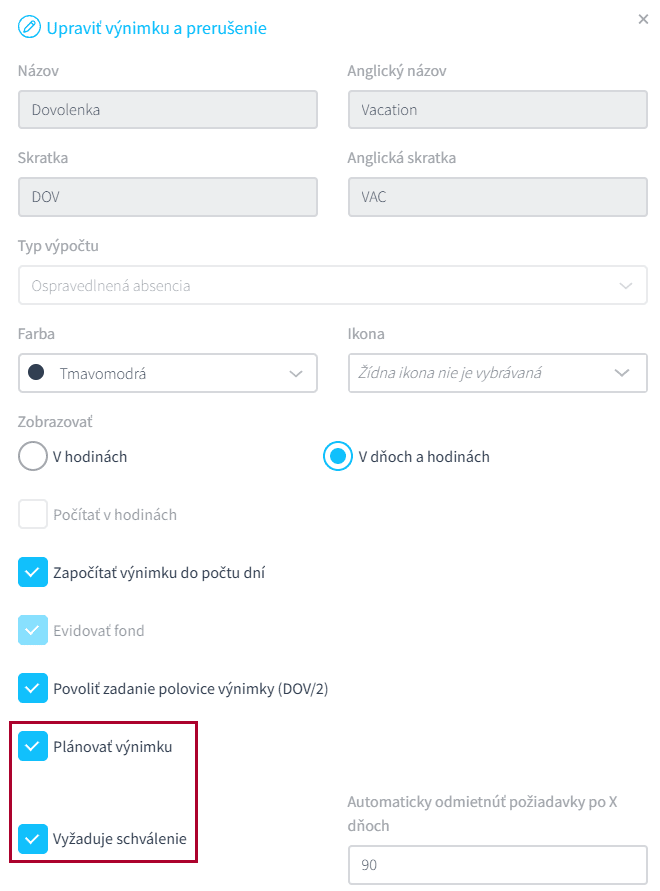 V detaile výnimky zakliknete voľbu Plánovať výnimku. Ak chcete, aby užívateľ, ktorý má právo na schvaľovanie neprítomností v danej prevádzke, túto výnimku schvaľoval, zakliknete tiež voľbu Vyžadovať schválenie a nastavenie uložíte.