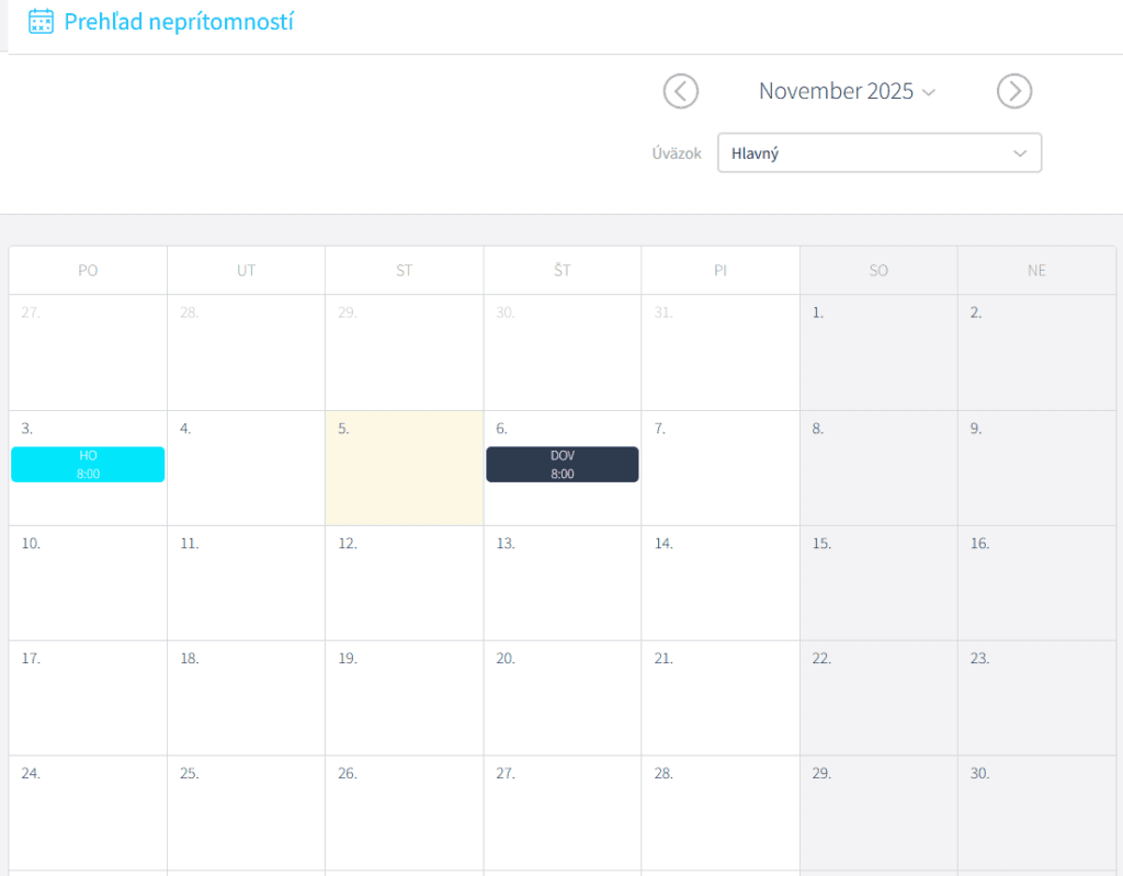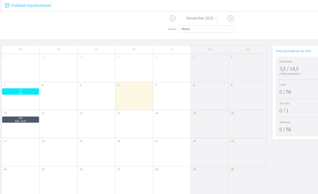 V kalendári sa neprítomnosť zobrazuje buď plnou farbou – čo znamená, že Vaša požiadavka bola už schválená vedúcim alebo šrafovane, čo označuje stav „Čaká na schválenie„.