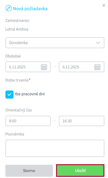 V zozname vyberiete plánovanú neprítomnosť a vyberiete obdobie. Následne požiadavku uložíte cez tlačidlo Uložiť. Vo formulári môžete zadať aj nepovinné údaje: Orientačný čas a Poznámka.