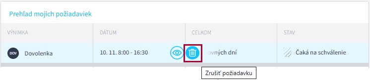 Ak sa pomýlite, tak požiadavku, ktorá ešte nebola schválená Vašim nadriadeným, môžete jednoducho zrušiť. Stačí ak sa na požiadavku postavíte myšou a kliknete na symbol koša. Tým sa požiadavka zruší a vedúci o tom bude automaticky informovaný.