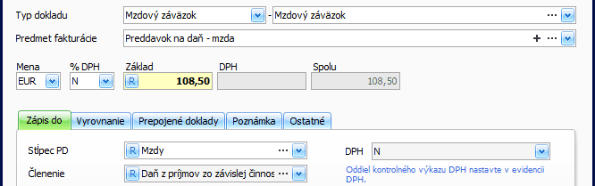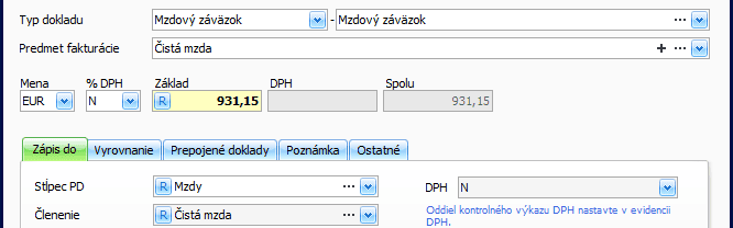 - typ dokladu vyberte Mzdový záväzok a vyplňte predmet fakturácie,