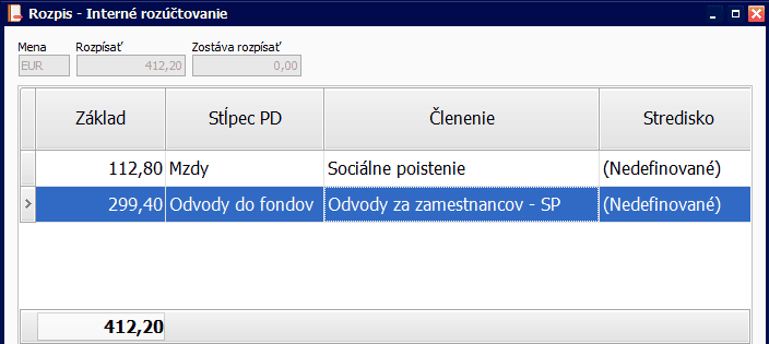 - nastavte sa na druhý riadok a opravte sumu na 299,40 eur. Stĺpec PD vyberte Odvody do fondov a doplňte členenie,