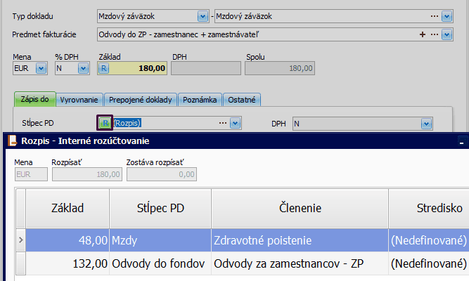 - nastavte na druhý riadok a opravte sumu na 132 eur. Stĺpec PD vyberte Odvody do fondov a doplňte členenie,