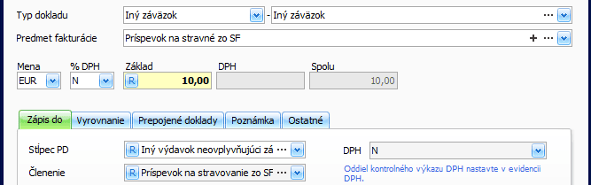 - doplňte sumu príspevku na stravné zo SF, stĺpec PD vyberte Iný výdavok neovplyvňujúci základ dane a doplňte príp. členenie.