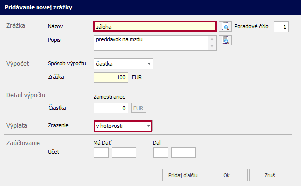 Pri pravidelnom vyplácaní zálohy, môžete pridať zrážku záloha priamo v Personalistike na karte Zrážky.