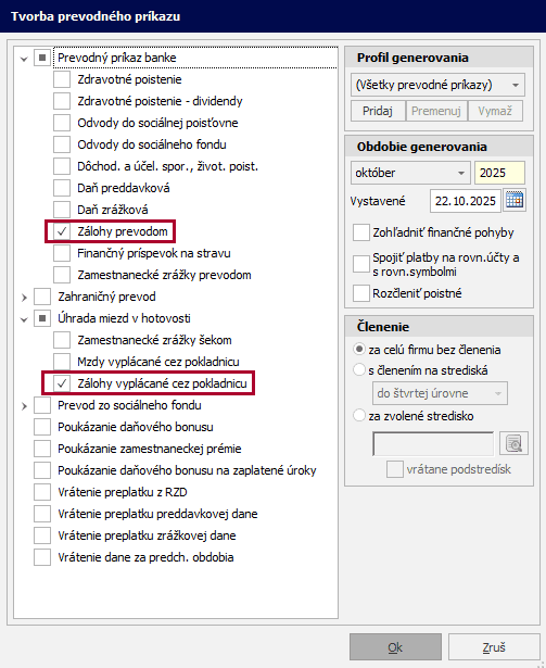 Keďže zálohu ste vyplatili pred výplatným termínom, prevodný príkaz vygenerujete v evidencii DOMOV – Prevodné príkazy. Označíte možnosti Zálohy prevodom (záloha na účet) a Zálohy vyplácané cez pokladnicu (záloha v hotovosti).