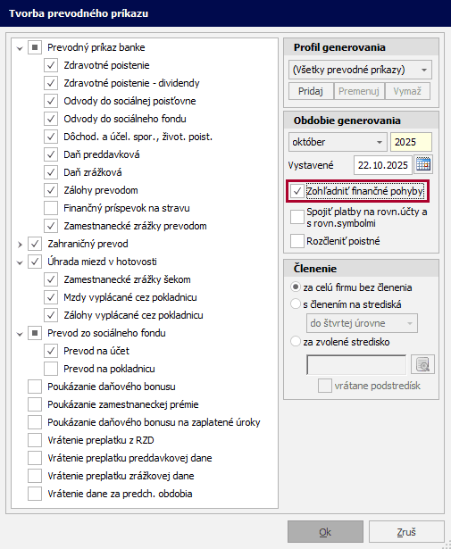 Po spracovaní miezd za daný mesiac pri generovaní prevodného príkazu označíte voľbu Zohľadniť finančné pohyby. Týmto krokom program zohľadní už vygenerovaný prevodný príkaz na zálohy.