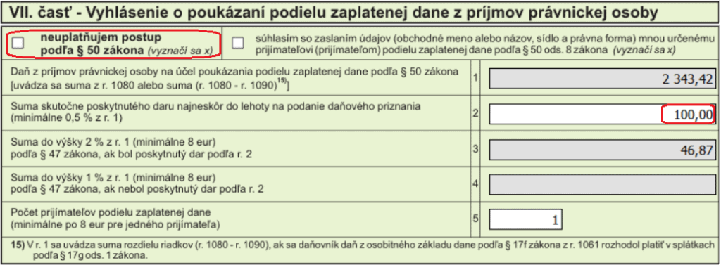 Informáciu, či daňovník uplatňuje alebo neuplatňuje postup podľa § 50 zákona o dani z príjmov, teda o poukázaní podielu zaplatenej dane, je potrebné vyznačiť na 14 . strane v VII. časti – Vyhlásenie o poukázaní podielu zaplatenej dane z príjmov právnickej osoby.