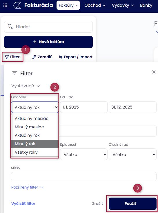 Vo Fakturácií sa v novom roku automaticky zobrazia len faktúry aktuálneho roka. Ak si potrebujete pozrieť aj staršie doklady, vľavo hore nájdete Filter, kde si môžete zvoliť Obdobie – Minulý rok alebo Všetky roky.