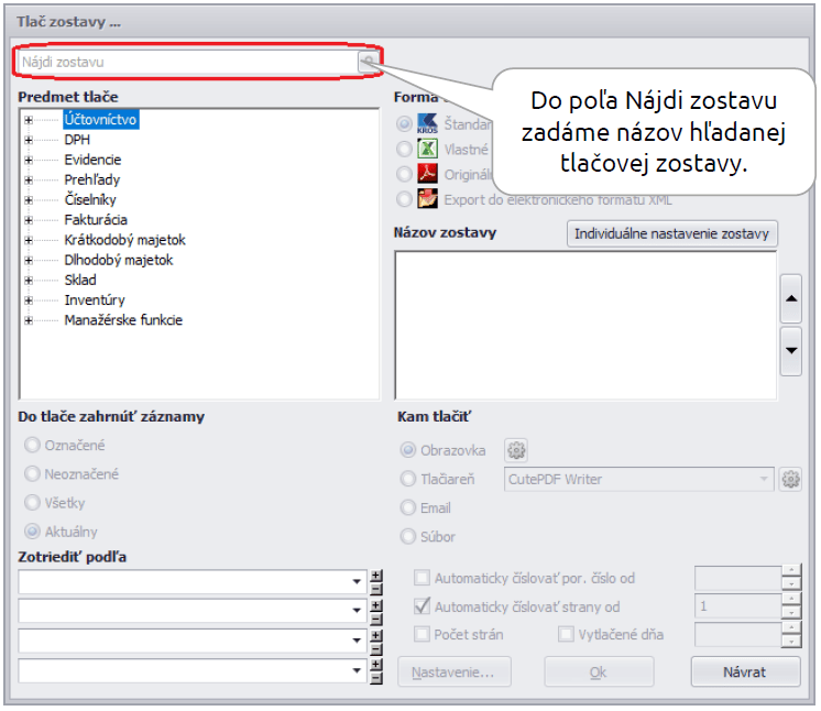 Na vyhľadávanie tlačových zostáv môžeme použiť vo formulári Tlač zostavy okno rýchleho filtra.