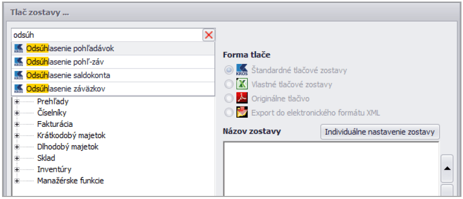 Ak nepoznáme konkrétny názov zostavy, stačí zadať iba časť hľadaného výrazu, napr. „odsúhlasenie“. Program OMEGA nám zobrazí zodpovedajúce výstupy, z ktorých si vyberieme požadovanú tlačovú zostavu.