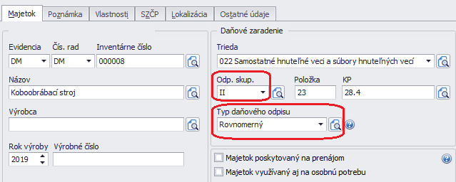 Spoločnosť chce zaevidovať do majetku kovoobrábací stroj, ktorý doteraz odpisovali v inom účtovnom programe. Majetok bol obstaraný a zaradený dňa 15. 4. 2019 vo vstupnej cene 9 500 eur. Je zaradený v odpisovej skupine 2 a bol odpisovaný rovnomerne. V roku 2020 prerušili na rok daňové odpisy. Účtovné odpisy boli od začiatku odpisovania do decembra 2024 v hodnote 7 520 eur.