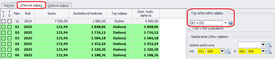 - Následne zmeníme typ účtovného odpisu podľa toho, ako chceme majetok odpisovať, napríklad ÚO = DO. Program automaticky vypočíta odpisy od aktuálneho roka až do úplného odpísania majetku, t. j. do výšky vstupnej ceny.