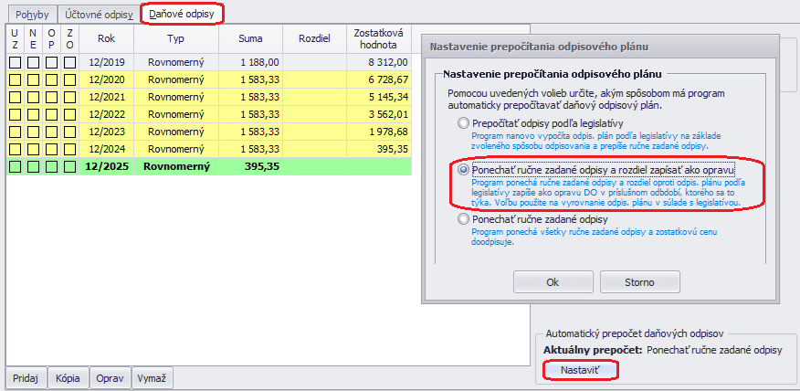 - V pravej dolnej časti klikneme na tlačidlo Nastaviť a zvolíme voľbu Ponechať ručne zadané odpisy a rozdiel zapísať ako opravu.