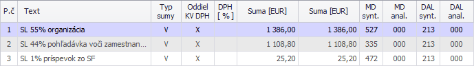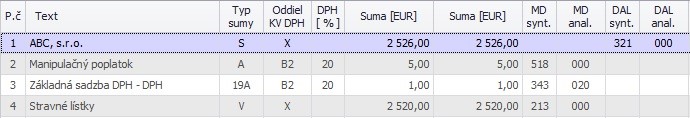 - Faktúru zaúčtujeme v evidencii účtovných dokladov do okruhu DF. Pri účtovaní použijeme automatické účtovanie 20 DF – Nový doklad (s rozpisom DPH). V rozpise DPH hodnotu za stravné lístky zadáme do riadku Neobsahuje DPH a hodnotu manipulačného poplatku do riadku Vyššia DPH.