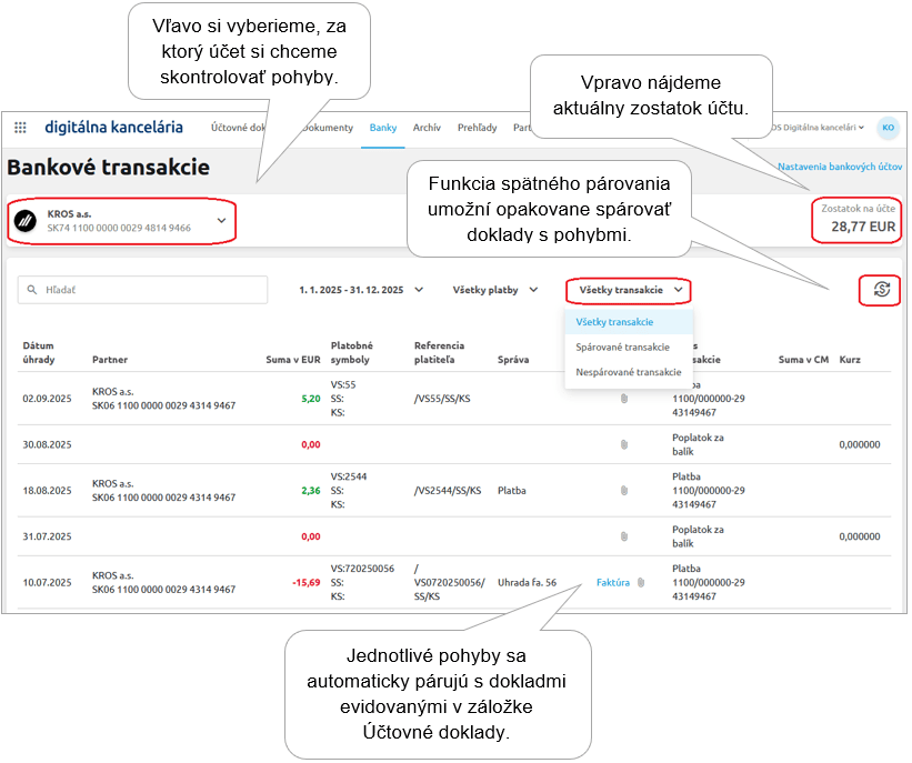 Jednotlivé pohyby a tiež úhrady dokladov nie je potrebné zapisovať ručne – transakcie sa automaticky spárujú s dokladmi evidovanými v záložke Účtovné doklady.