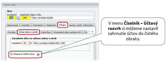 Vo všeobecnosti to znamená, že čistým obratom je hodnota výnosov účtovaných na účte 601 – Tržby za vlastné výrobky, 602 – Tržby z predaja služieb a 604 – Tržby za tovar.