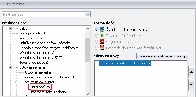 Pre obidva typy účtovných jednotiek odporúčame použiť Výkaz ziskov a strát – informatívny. Zostavu vyberieme cez menu Prehľady – Výkaz ziskov a strát v databáze roku 2020.