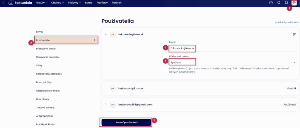 Rola Vlastník bola automaticky priradená používateľovi, ktorý založil firmu v KROS Fakturácií, nemožno ho vymazať ani mu meniť role. Vlastník a Správca môžu pridávať a meniť role ostatným používateľom.