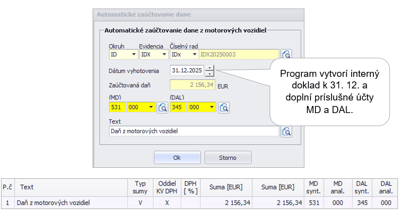 Program do nami zvoleného číselného radu vytvorí interný doklad k 31. 12. daného roka. Doplní aj príslušné účty MD a DAL, ktoré si v prípade potreby môžeme upraviť.