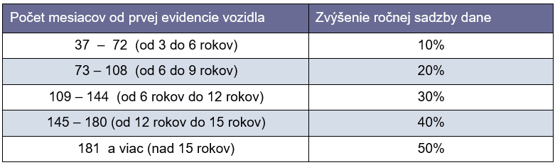 - Zrušenie zníženia ročnej sadzby dane a nové pravidlá pri zvyšovaní ročnej sadzby dane v závislosti od veku vozidla