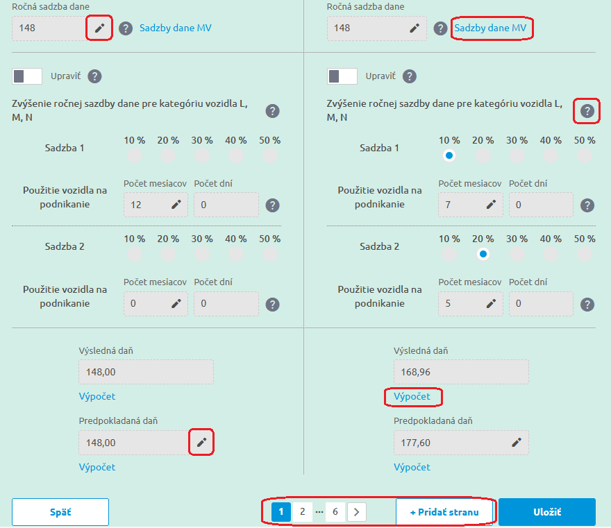 Na základe údajov zo záložky Vozidlá aplikácia vypočíta aj výšku predpokladanej dane, ktorá sa potom prenesie do riadku 40 na štvrtej strane v DPMV. Vypočíta sa ako súčet všetkých predpokladaných daní za jednotlivé vozidlá v DPMV.