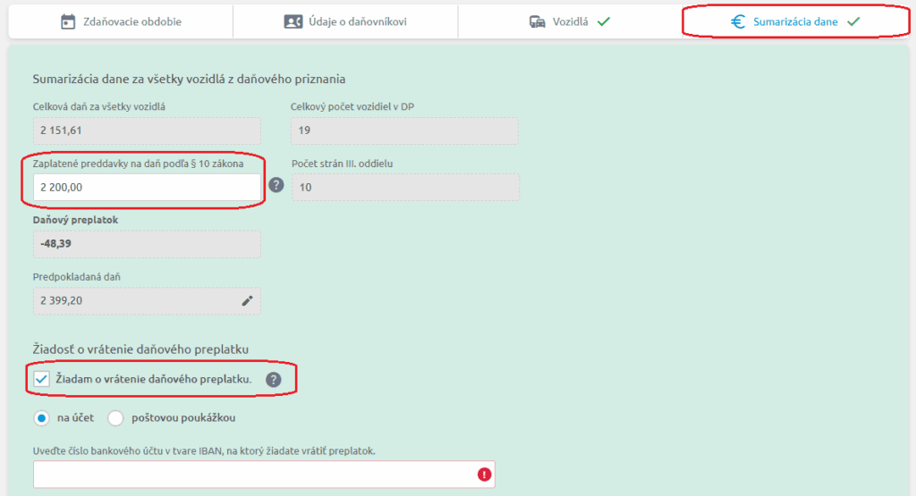 Po uložení sa presunieme do poslednej záložky Sumarizácia dane. V nej nájdeme sumarizáciu dane a predpokladanej dane za všetky vozidlá uvedené v daňovom priznaní.