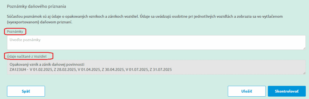 V dolnej časti záložky Sumarizácia dane máme možnosť uviesť ľubovoľnú poznámku, ktorá sa následne prenesie do VII. Oddielu tlačiva DPMV. Súčasťou poznámok sú aj údaje o opakovaných vznikoch a zánikoch daňovej povinnosti vozidiel. Táto informácia sa zo záložky Vozidlá automaticky uvedie do bunky Údaje načítané z Vozidiel a následne sa tiež prenesie do VII. oddielu tlačiva daňového priznania.