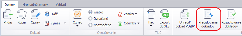 Hromadné prečíslovanie dokladov vykonávame cez menu Evidencia – Účtovné doklady – Domov – Prečíslovanie dokladov.