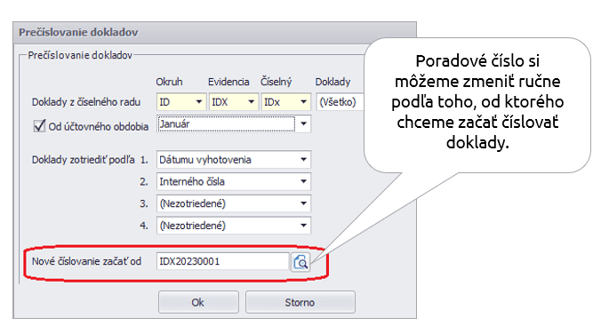 Funkciu hromadného prečíslovania dokladov môžeme využiť napríklad pri zmene spôsobu číslovania dokladov, alebo ak sme vymazali niektoré doklady, čím sme narušili číselný rad v programe.
